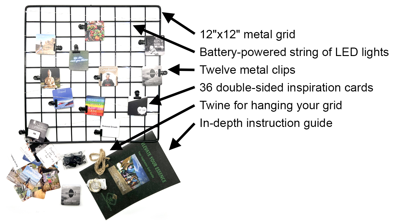 Do you ever find yourself feeling so overwhelmed by everything you want to achieve? Goal setting has never been so easy! The Inspiration Grid is a vision board recreated. It is the ultimate goal setting tool that is quick and easy to set up, and conducive for continued growth and goal adjustments. This inspiration grid will help keep your focus and motivation to elevate your essence and achieve your dreams. Everything you need is included: grid, clips, string, lights, instructions, and inclusive inspiration cards that can be easily exchanged as you reach your goals. Bring your inspiration grid to campus as DIY kit or a goal setting workshop.