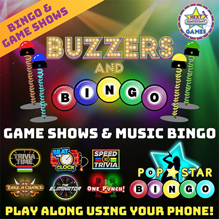 Your entire audience feels the BUZZ during six rounds of name-that-tune BINGO featuring hit songs from different decades & genres PLUS six fast-paced game shows! Contestants use their phones & wireless game show buzzers to play along! Includes: Popstar Bingo, Trivia Time, Beat The Clock, Speed Trivia, Take A Chance, The Eliminator, and One Punch! (up to 500 people)