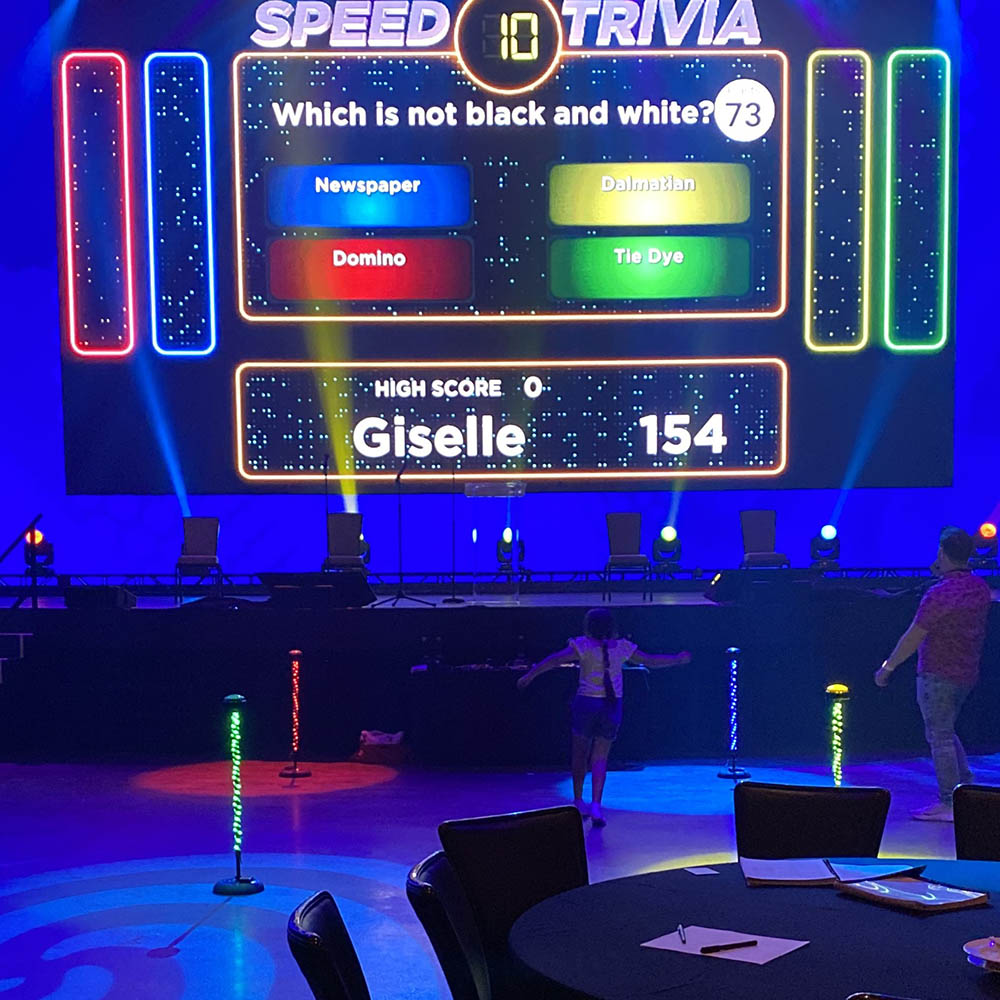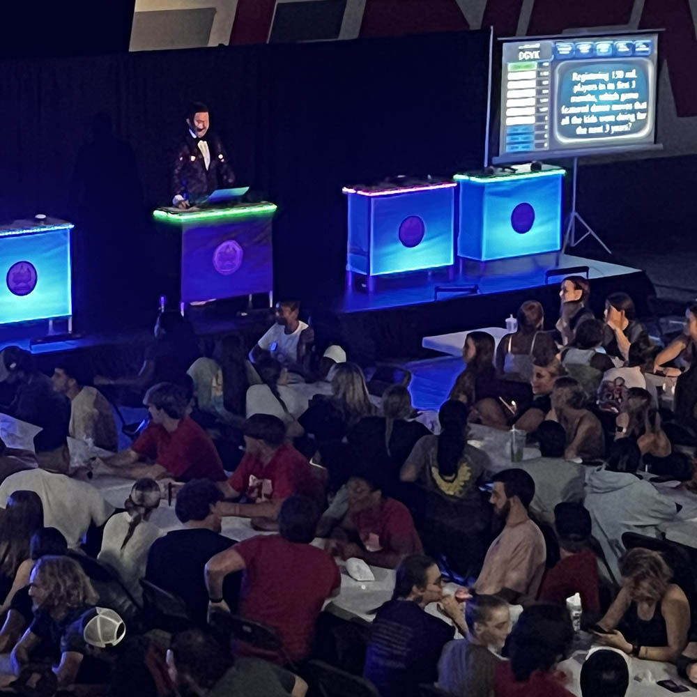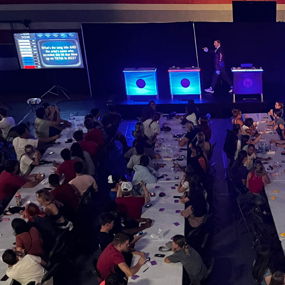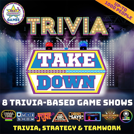 A classic combo of 8 retro game shows that cater to crowds of smarty pants players ready to flex their BRAIN muscles (NOT their dancing feet or singing abilities) and show off their trivia knowledge, strategize as a team and sabotage competitors to WIN! Includes: Quiz Show, I Know That Tune, Trivia Time, The Big Pyramid, Crowd Says, Majority Rules, Take A Chance, and Code Breaker. (up to 1000 people)