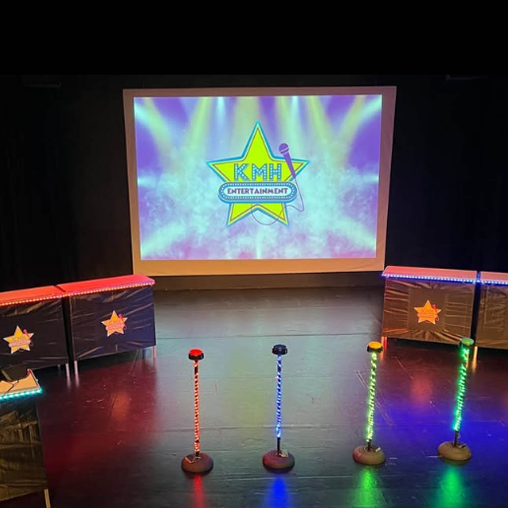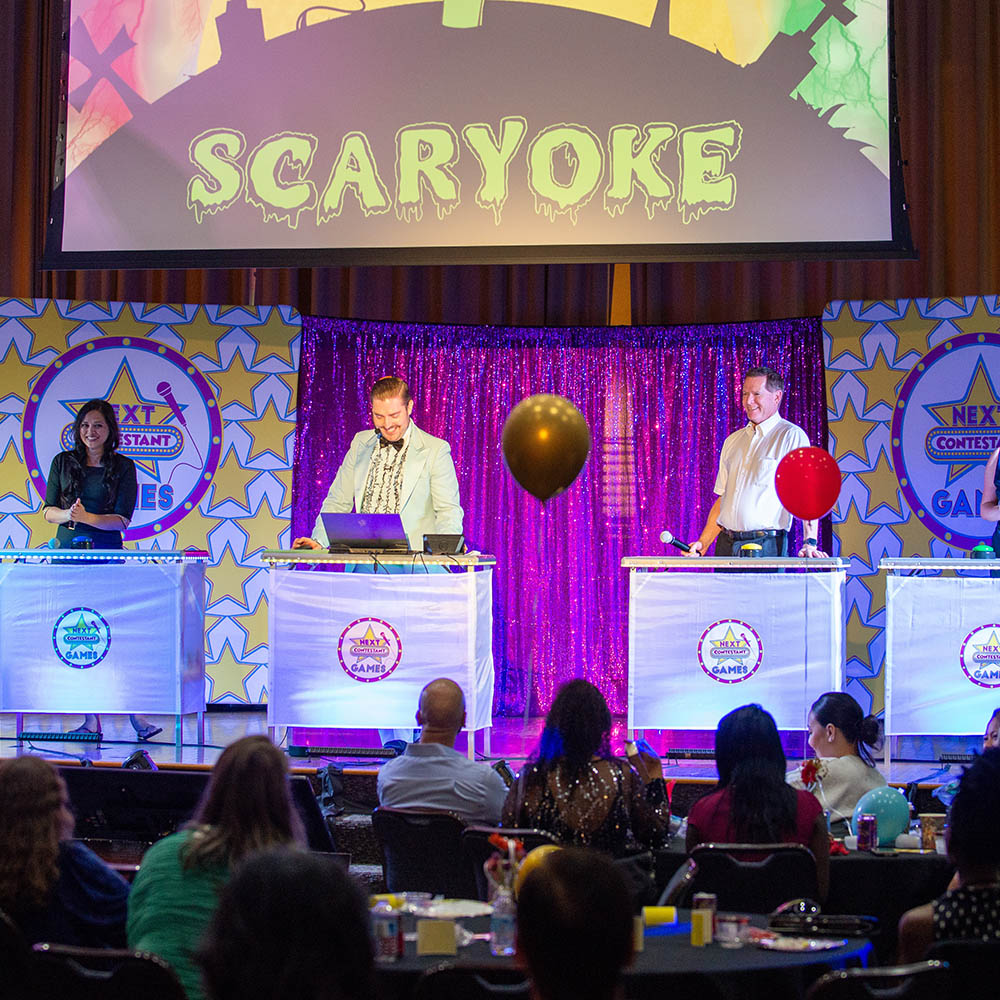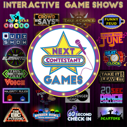 Perfect for a rowdy crowd ready to dance, sing & laugh along with hilarious trivia, popular playlists & funny physical challenges. Contestants use wireless game show buzzers, silly props and cell phones to play along. Includes: Quiz Show, I Know That Tune, Crowd Says, Majority Rules, Wheel of Ill Will, and Scaryoke! (up to 1000 people)