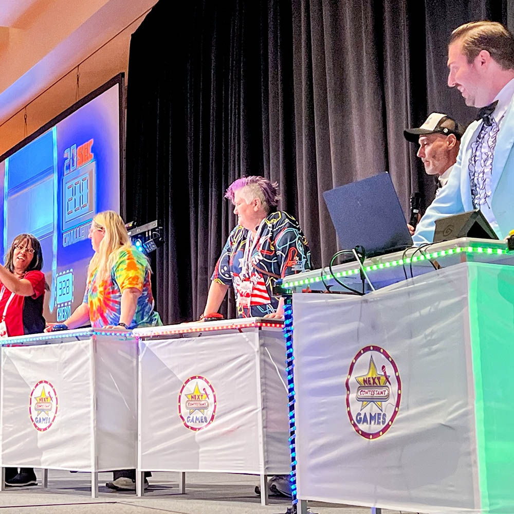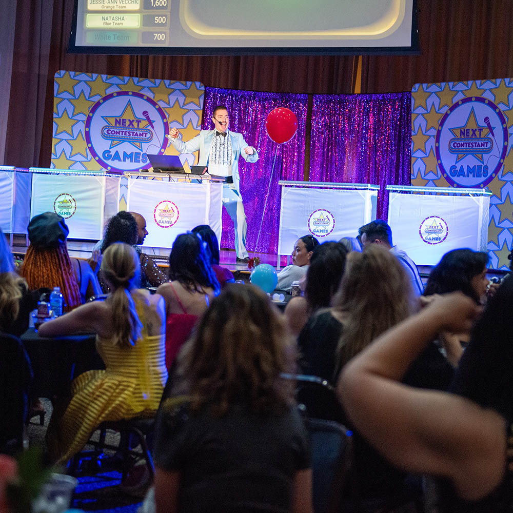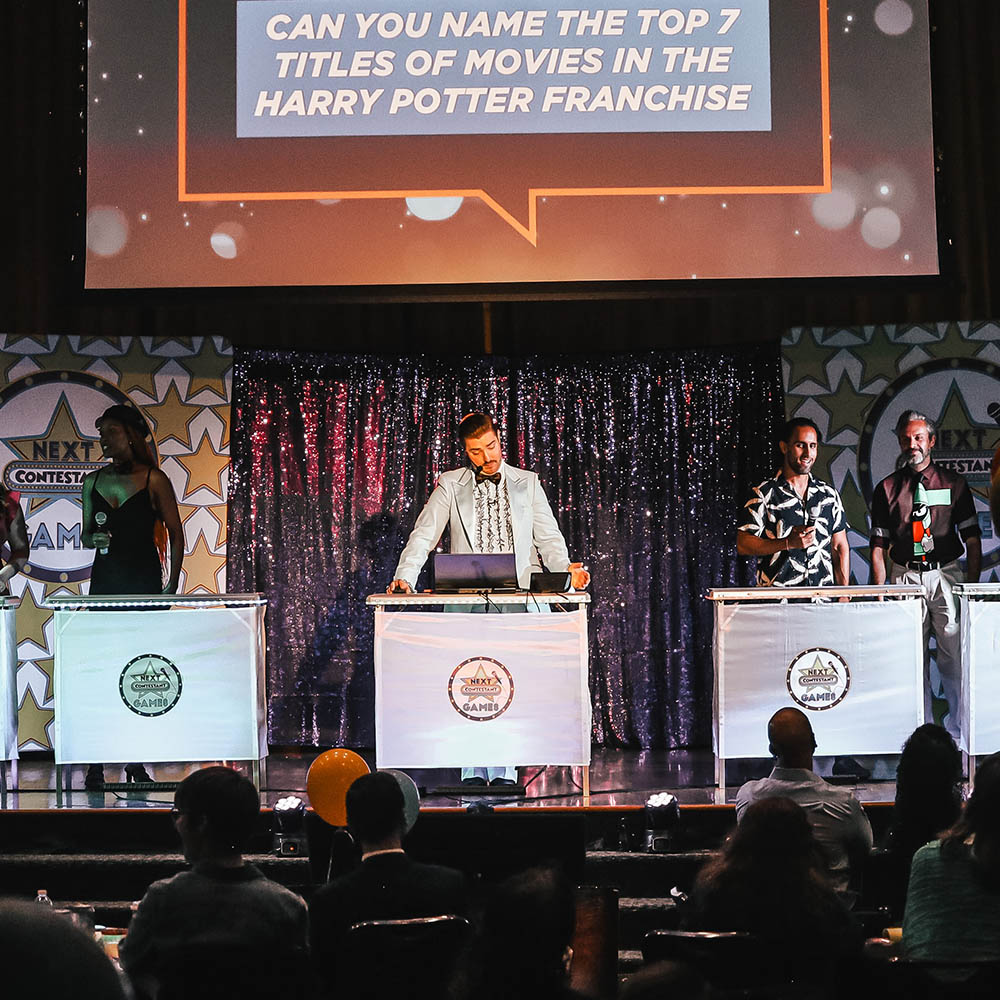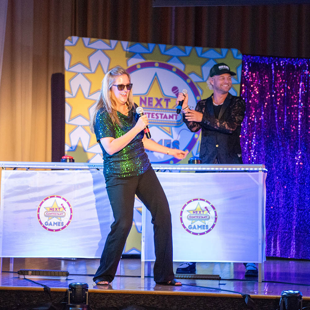 With Next Contestant Games, your entire audience get to play along with six classic game shows designed just like your favorites from TV! Our Game Show Hosts aren't just touring comedians, they're also talented DJs, ready to get your whole group laughing, dancing, singing and buzzing along with the fun! Games combine elements of comedy, trivia, music, and mayhem (in the form of funny physical challenges.) Contestants use wireless Game Show Buzzers, silly props and cell phones to participate. We have thousands of themes and can cater our content to crowds of any size and demographic! Plus, we have packages to perform multiple nights in a row with brand new games every time! Created by a one of the writers for "Disney Quizney" (the first live game show on Disney+), Next Contestant Games hosts have headlined casinos, colleges and comedy clubs in all 50 states as well as aboard Royal Caribbean and American Cruise Lines. Step up your game for the next large-group event and book Next Contestant Games to engage and entertain the entire audience the entire time!