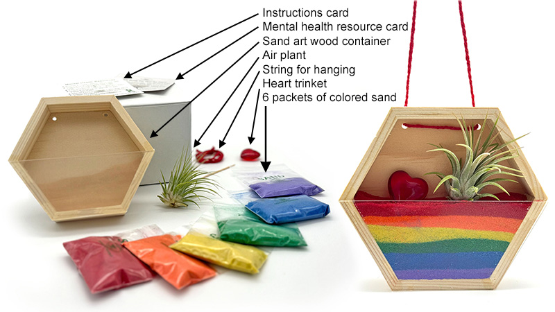 Keep Calm and Plant On! Need a creative DIY project that enhances your mental and emotional health? Elevate your space with a harmonious blend of Sand Art and Air Plants. These low maintenance plants and creative sand art will set a peaceful environment perfect for studying by alleviating stress, improving focus and productivity. Our kits contain one wood container, 6 sand colors, twine to hang your masterpiece, a themed trinket, and an air plant. Each kit is also packed with simple step-by-step instructions on how to put the kit together, and how to care for the air plant. Whether you're a new or seasoned crafter, this kit is perfect for events, small groups, or even alone in your own space!