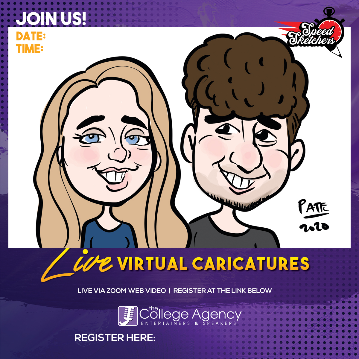 - Digital, black and white or full color artwork files and attendance sent to you at or after the event. Done virtually from guests homes or on campus